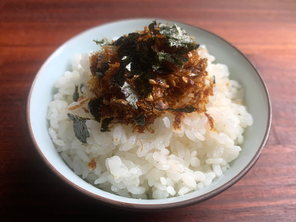 The other day, my daughter asked me to help her with using up a lot of food. One of them was ‘Hanakatsuo’, that is the larger flakes of shaved ‘Katsuobushi’, dried Bonito. It seemed she bought it to make Dashi Stock. Today I used it to make this Furikake. It is not dry like store …
