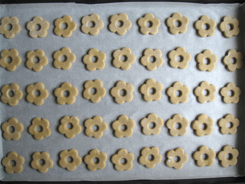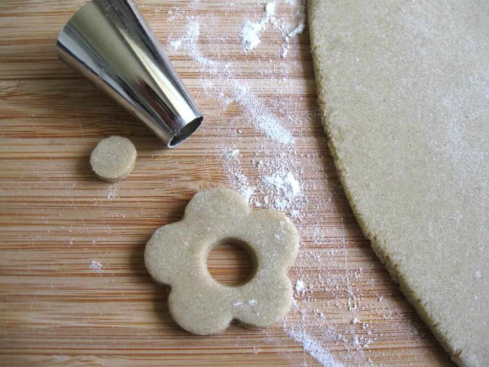 - Roll out the dough on a floured surface to 3-4mm thick and cut out using your favourite cutter. I used a flower shaped vegetable cutter and 1cm round piping nozzle.