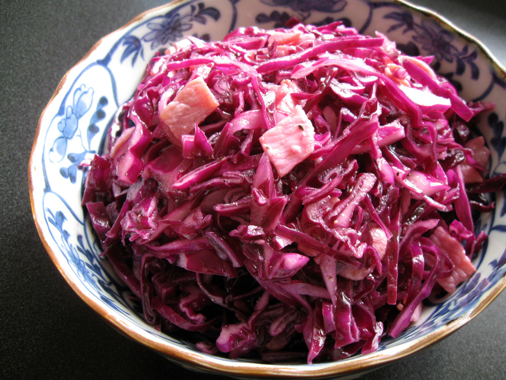I love the crunchy texture of Red Cabbage. It is an antioxidant-rich vegetable that has a great mix of vitamins and minerals. Here is another way to enjoy it. This is a salad and you don’t cook Red Cabbage, but texture is as if stir-fried. Bacon adds umami and saltiness. It’s delicious and very CRUNCHY! …