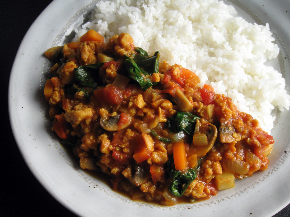Mice type Soy Meat (Soy Protein) is perfect for my ‘Clean-Up-Fridge Curry’. I usually use minced Beef or Pork, but this is a really good Vegan alternative. My meat-loving husband would’t notice this is Soy Meat curry. The recipe is almost identical, but you need to add more liquid as Soy Meat is quite dry …