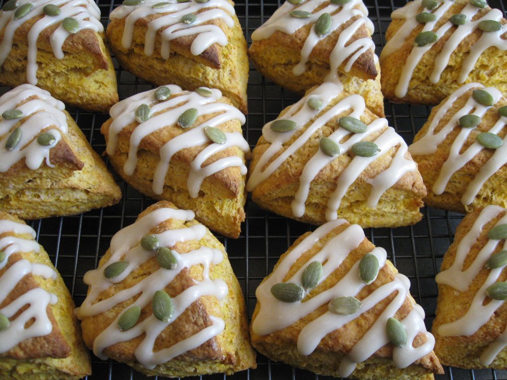 All my Scone recipes are based on Auntie Lorna’s Scone recipe. I needed to alter the amount of Milk for these scones because I added 1/2 cup pureed Pumpkin. It is a coincidence that these Pumpkin Scones have a strong resemblance to the famous coffee shops’ scones. I have never been to those coffee shops …