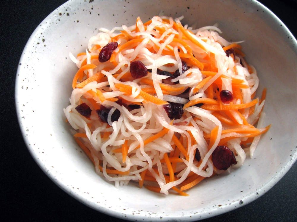 Daikon & Carrot ‘Namasu’ is a very simple Japanese salad, that is often prepared for New Year celebration because of the joyful red & white colours. I often crave it when I am physically tired. Normally I use Rice Vinegar to make this salad, but I used White Wine Vinegar today, and added Dried Cranberries. …