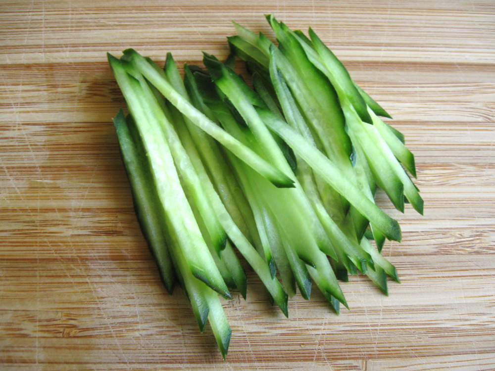 Without a vegetables slicer, you can cut Cucumber into thin OR very thin strips. This method actually works better than the vegetable slicer. When you mix Cucumber with noodles, this is the best way to cut it. Method