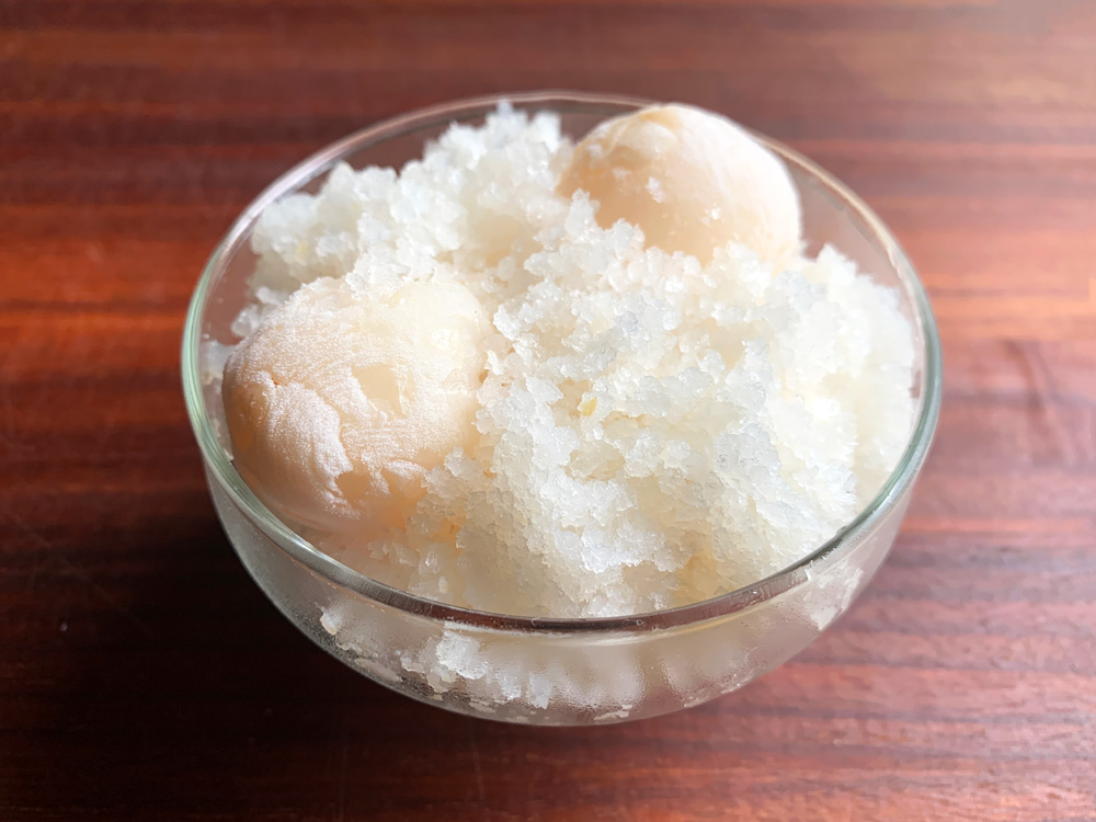 This is a lovely summer treat, which can be made with just 1 can of Lychees in Syrup. Blend the the content of the can of Lychees into smooth puree, add a little bit of Lemon Juice and Sugar if you like, freeze it until icy, then use a fork to break up into crystals. …