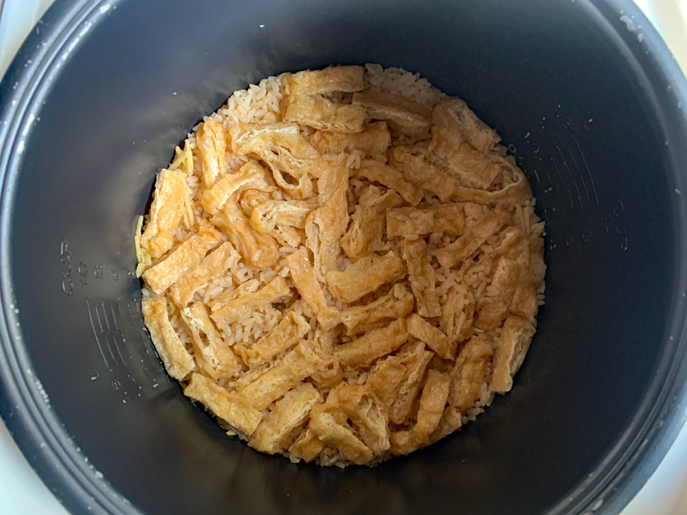 My ‘Soy Sauce Rice’ is delicious as it is, but ‘Abura-age’ (Fried Thin Tofu) can add extra flavour and Umami to it. ‘Abura-age’ might be too difficult for you to find. Fried Tofu called ‘Tofu Puff’ is a very similar food and it is easier to find as many Asian grocery stores sell it. You can use Tofu Puffs instead.