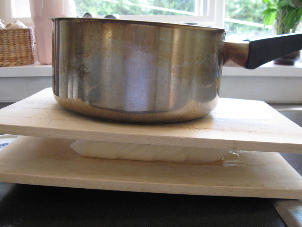 - Place Tofu on slightly tilted cutting board or plate, and place a flat-base dish or board with a weight on top. I use a saucepan with water in it as the weight. Then set aside for 1/2 hour so that excess water would be removed. Cut into about 4-5cm size pieces.