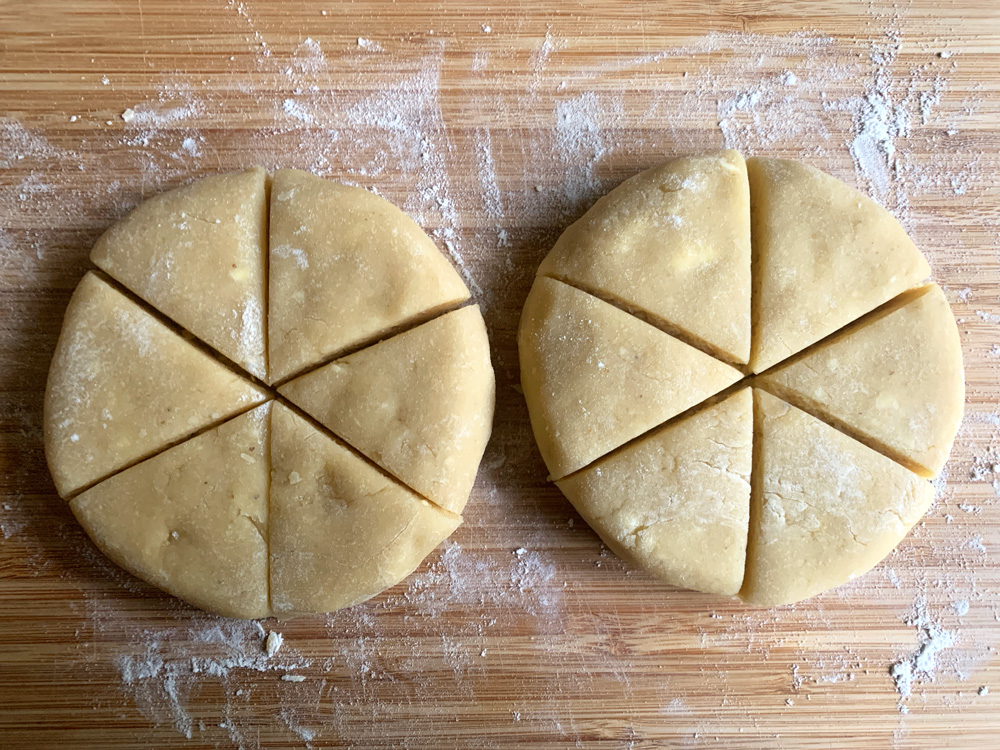 - Divide the dough in half. On a well floured surface, gently flatten each dough to 2cm thick round. Cut each round into 6 pieces.