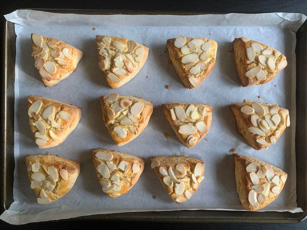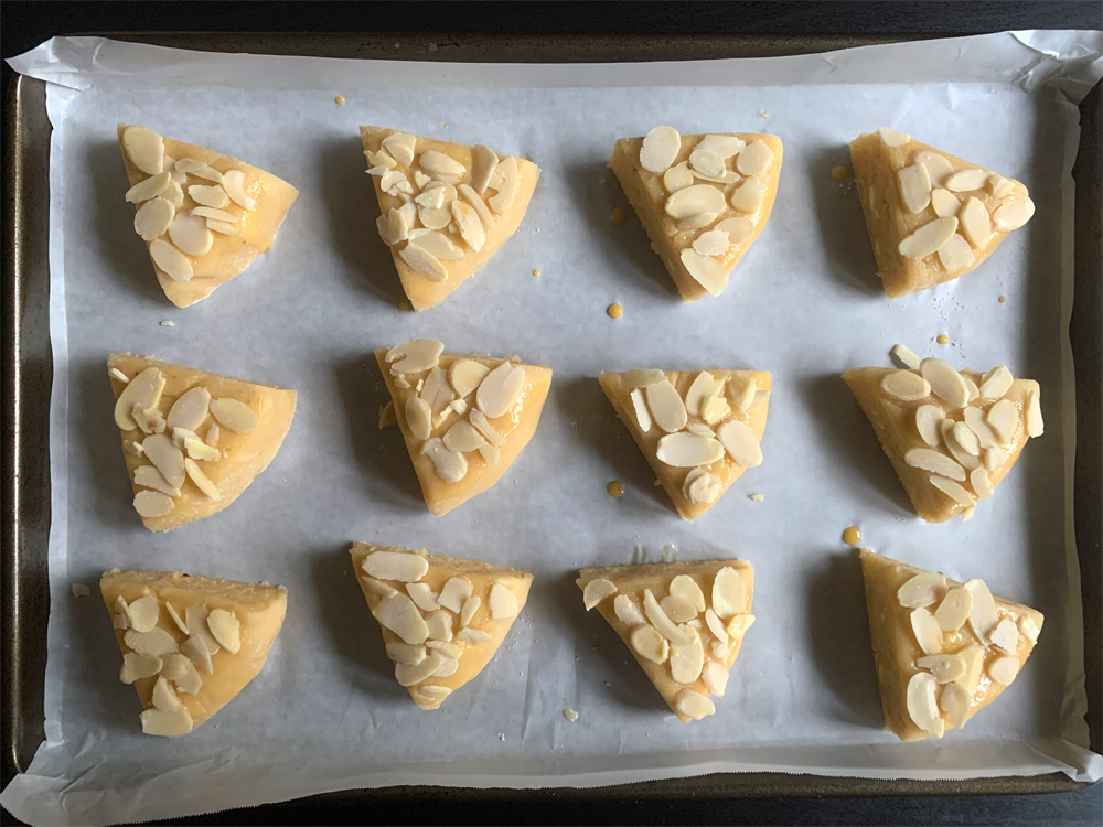 - Place the scones on prepared tray, brush each scone with the saved Egg, cover with some Almond Flakes, and bake for 20 minutes OR until nicely browned and cooked though. Transfer to a wire rack and cool completely.