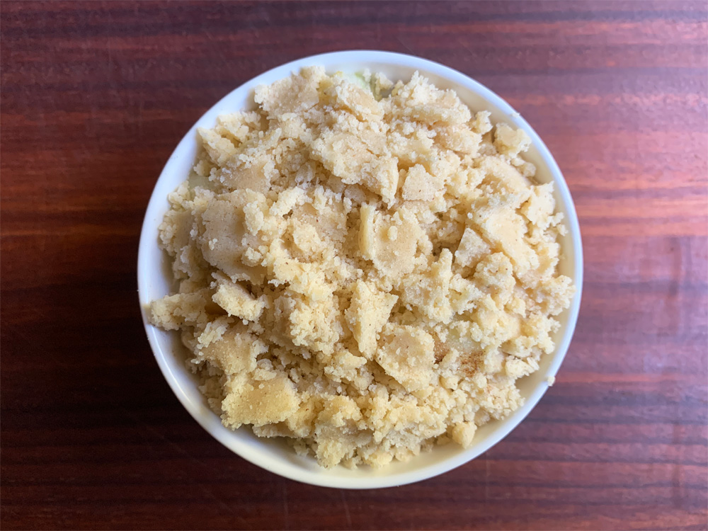 - To make Crumble, combine softened Butter and Sugar. Add Flour and Cinnamon, and mix well. Probably the mixture is too soft. Add 1 to 2 teaspoons extra Flour OR Rolled Oats, and make the mixture into crumble.