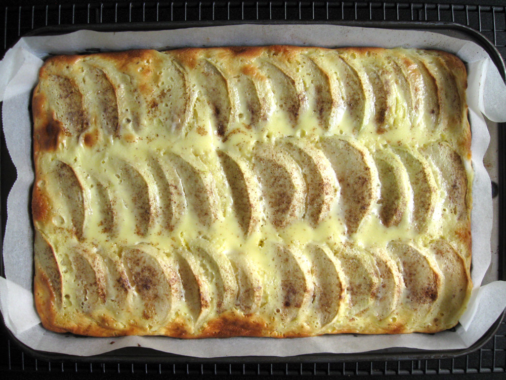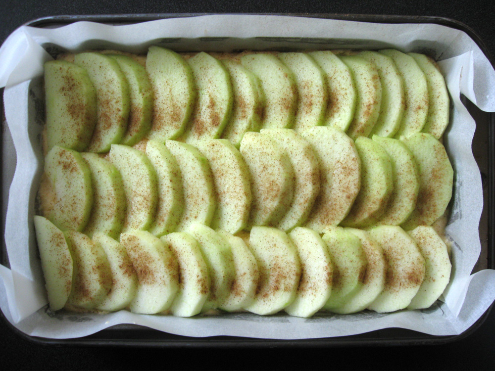 - Peel Apples, remove the core, and cut into 2-3mm thin slices. Arrange the slices over the cake batter, then sprinkle with Ground Cinnamon.