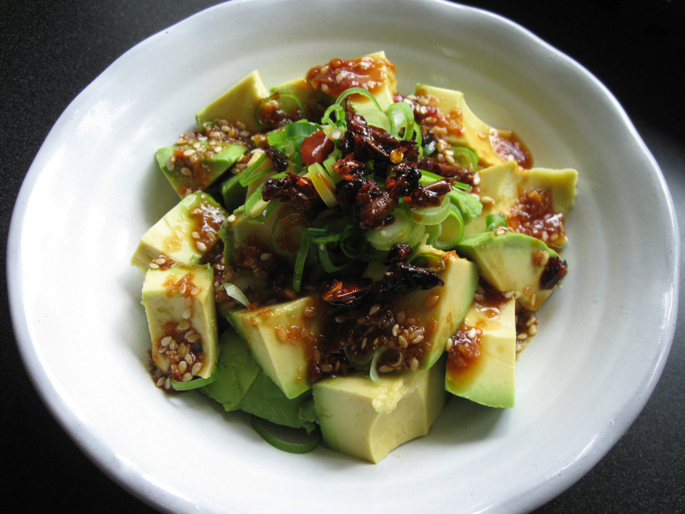 - Cut Avocado into bite-size pieces and place on a serving plate. Pour some ‘Yakiniku’ Sauce and add finely chopped Spring Onion. I added some Crispy Chilli Oil as well.