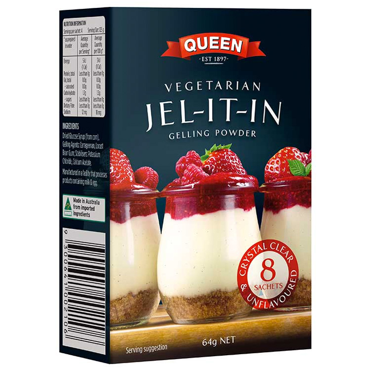 1 sachet (8g) Queen’s ‘Jel-It-In’ Vegetarian Gelling Powder *OR 4g (1 & 1/4 teaspoons) Agar Agar Powder