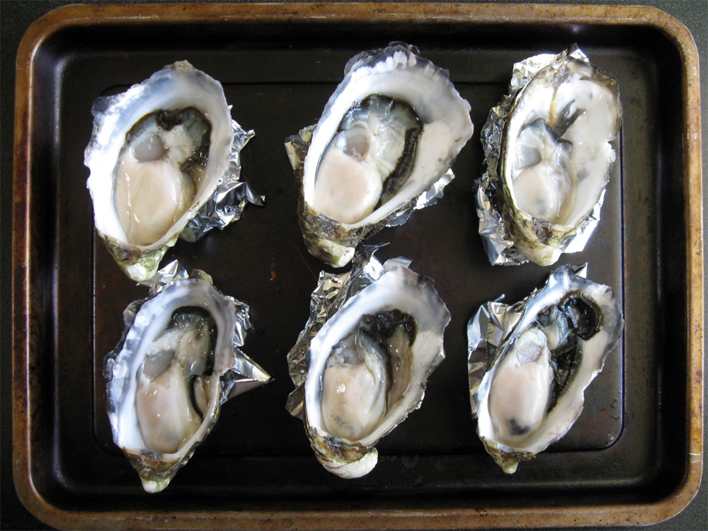 - Place Oysters on the half shell on a baking tray using foil to stabilise the shell.