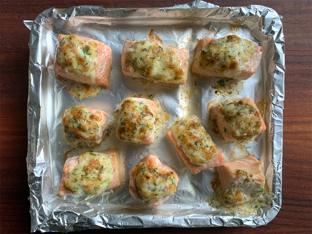 - Dry Salmon pieces with paper towel if they are wet. Sprinkle with some Ground Pepper, place on the prepared tray, spoon the sauce on top of each piece.