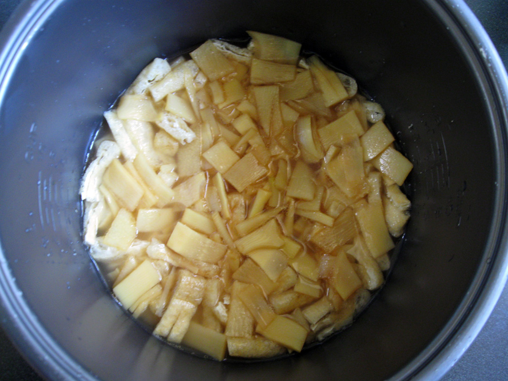 - Scatter Abura-age pieces and Bamboo Shoot pieces with all the liquid over the Rice, but DO NOT stir. Press ‘COOK’ button to start cooking.