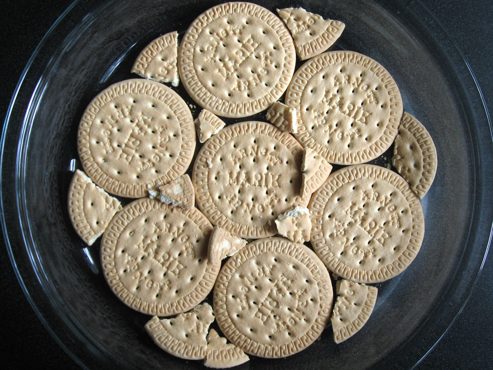 - Cover the base of a baking dish with Sweet Biscuits. Break them if necessary.