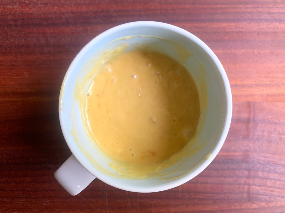 I had a small Banana that had turned brown. It was a perfect Banana to make a Banana Cake, but 1 small one was not enough. Once I thought about Banana Cake, I couldn’t stop the craving for Banana Cake. The solutions is Mug Cake. Absolutely quick and easy. It took me less than 5 minutes to make it. The Banana was very sweet, so I added just 1 tablespoon Sugar. You might wish to add a little bit more.