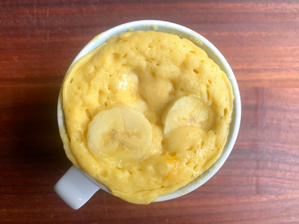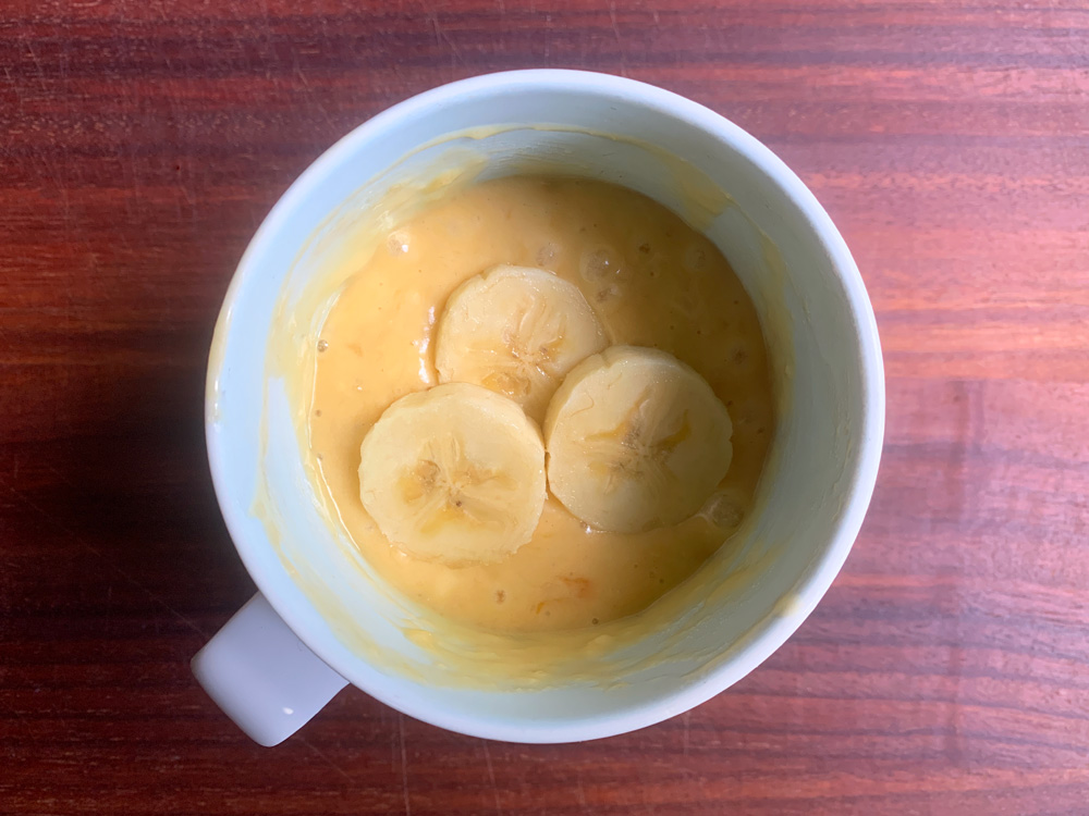 - Slice Banana, save some slices for topping, add the sliced Banana to the mug, and mash with a fork smoothly OR coarsely. Add Egg and mix well, then add Self-Raising Flour, and mix well. Arrange the saved Banana slices on top. *Note: The saved slices can be arranged after the cake is cooked.