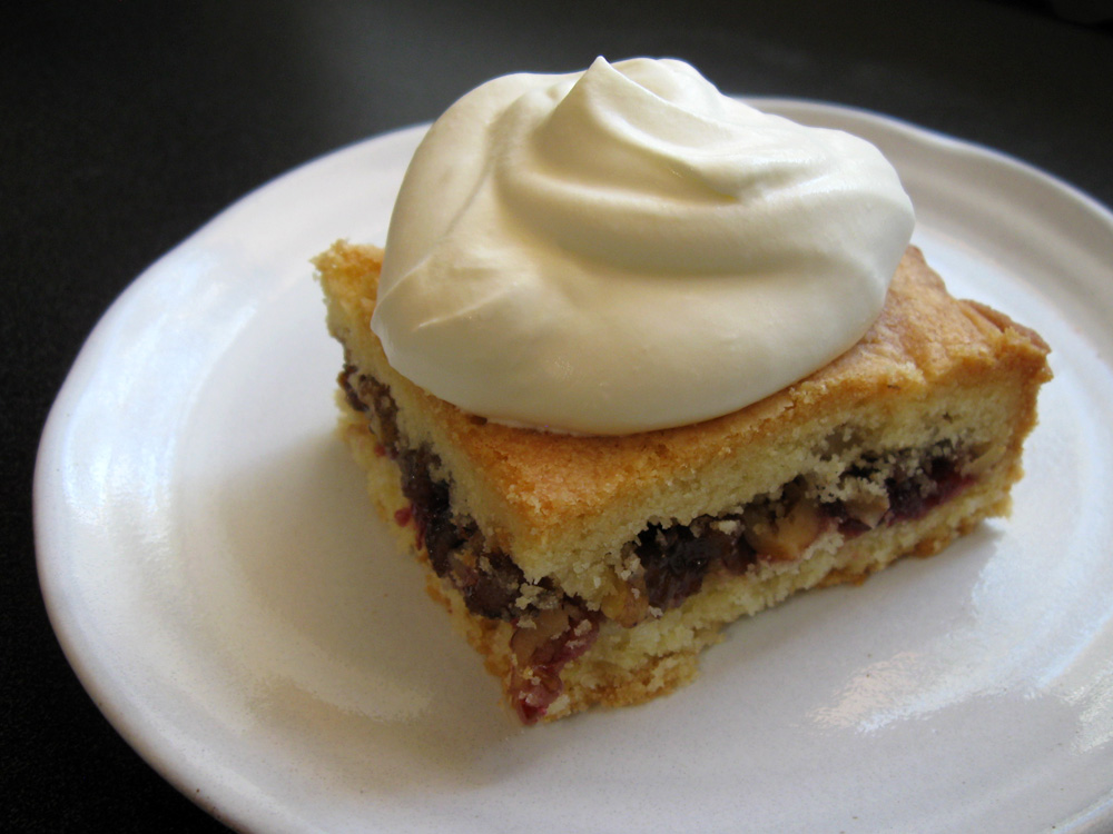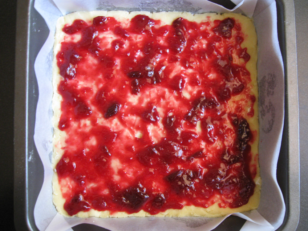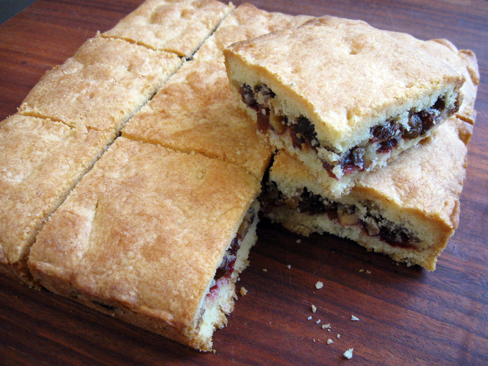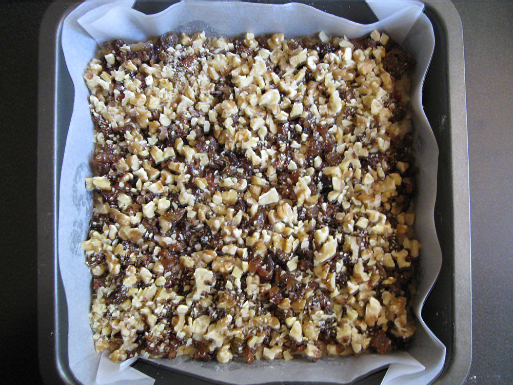 - Roll out 1/2 of dough on a floured surface, and line the tin. Patch up any gaps and tears, and press down evenly. Thinly spread Jam, then scatter chopped Raisins (OR Sultanas) and Walnuts.