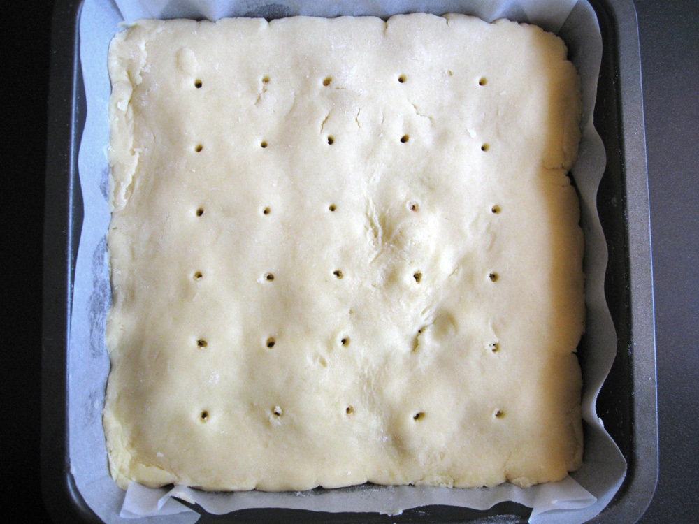 - Roll out the other 1/2 of dough into a square and place it on top to cover. Make holes in a pattern using a skewer.