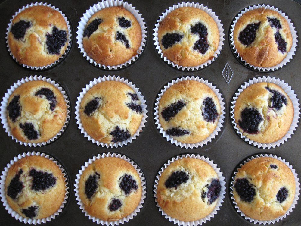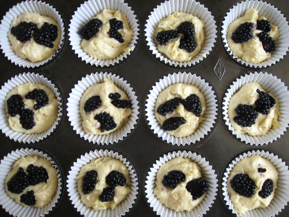 - Spoon the mixture into the paper cases, add Blackberries on top and gently push them into the batter. *Note: Tear the Blackberries in half if large.