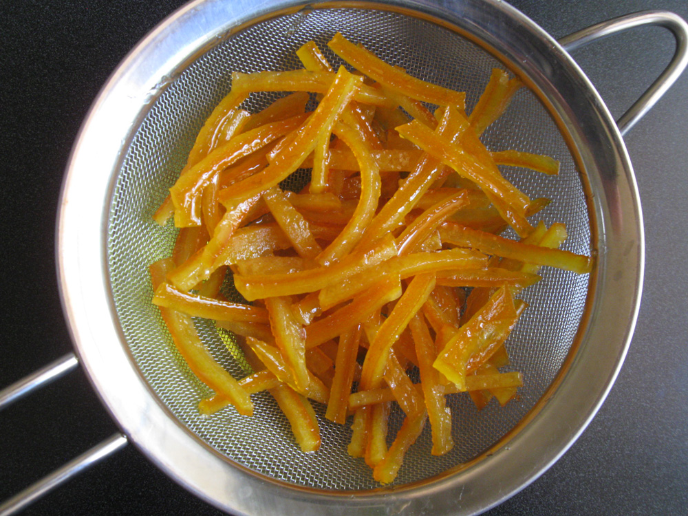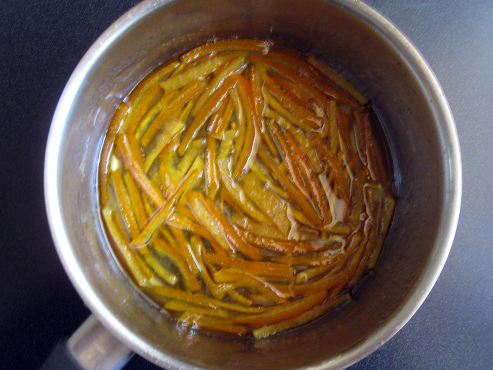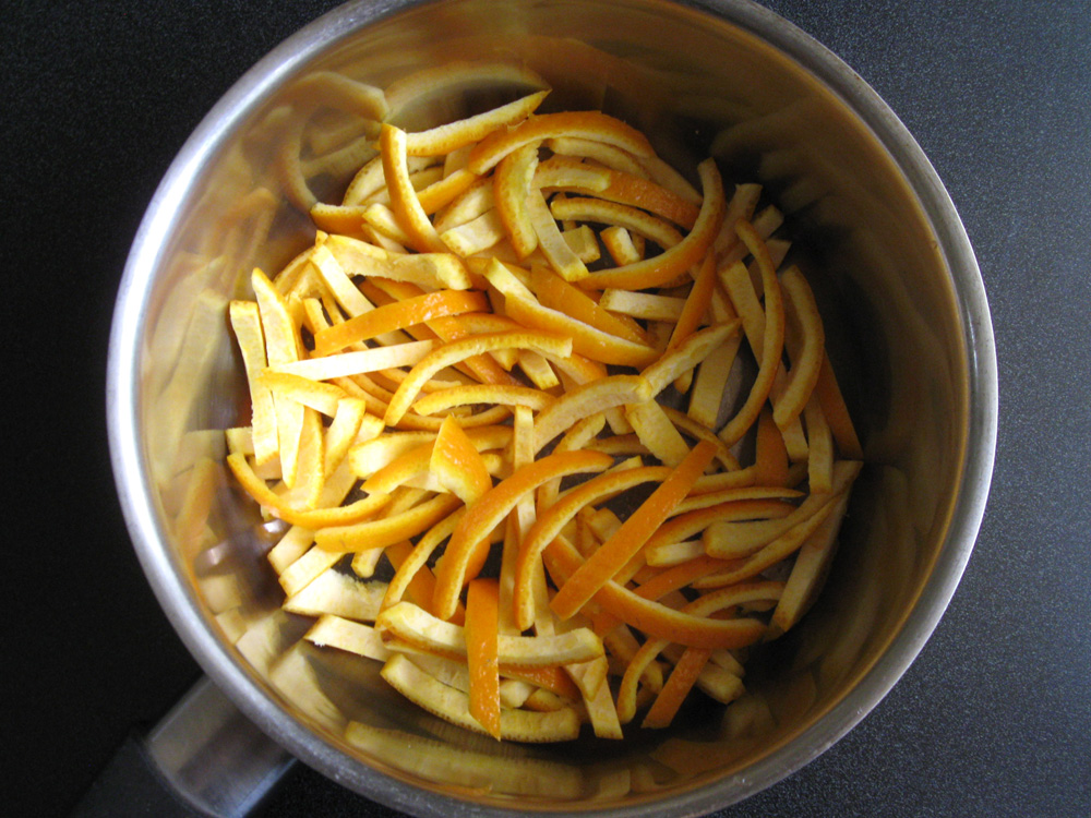 - Slice the peels into 6-7mm wide strips, place in a saucepan, cover with plenty of water, cook for 15 minutes, then drain. This process is for removing the bitterness that comes from the white pith.