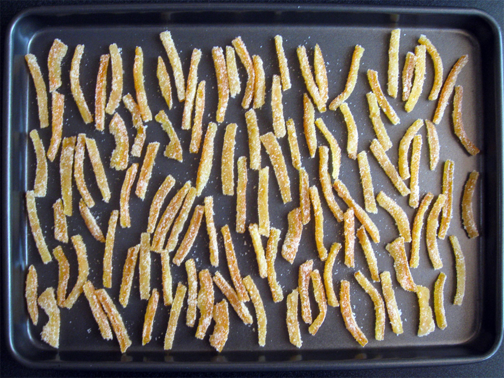 - Spread some White Sugar (OR Brown Sugar) on a plate and roll some of the Peel strips to coat. Transfer to a large tray. Repeat the process and coat all the Peel strips with Sugar, then set aside for a few hours to dry. *Note: I placed the tray in the cool oven.