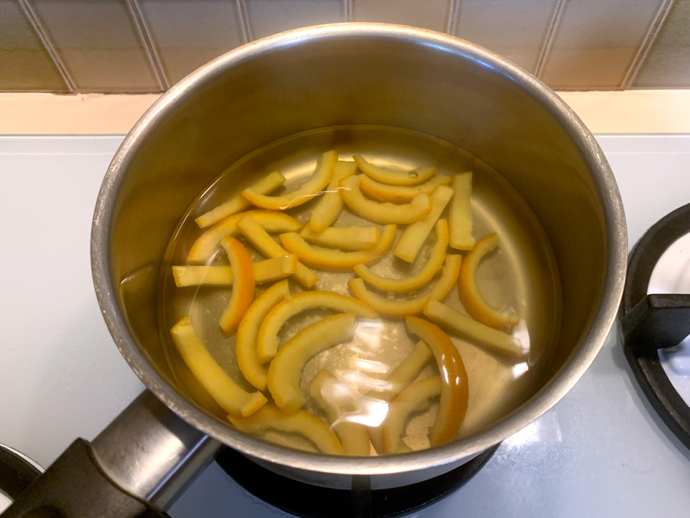 - Cut the peels into 6-7mm wide strips. Place in a saucepan, cover with water, bring to the boil, and cook for 15 minutes, then drain. *Note: This process is for removing the bitterness that comes from the white pith.