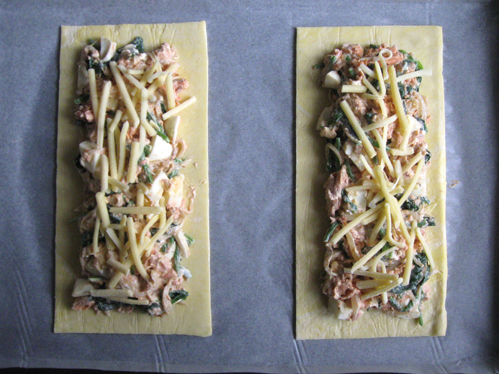 - Lay 2 sheets on a baking sheet or tray lined with baking paper. Place the Salmon mixture on the pastry sheets. Scatter some shredded Cheese if you like.