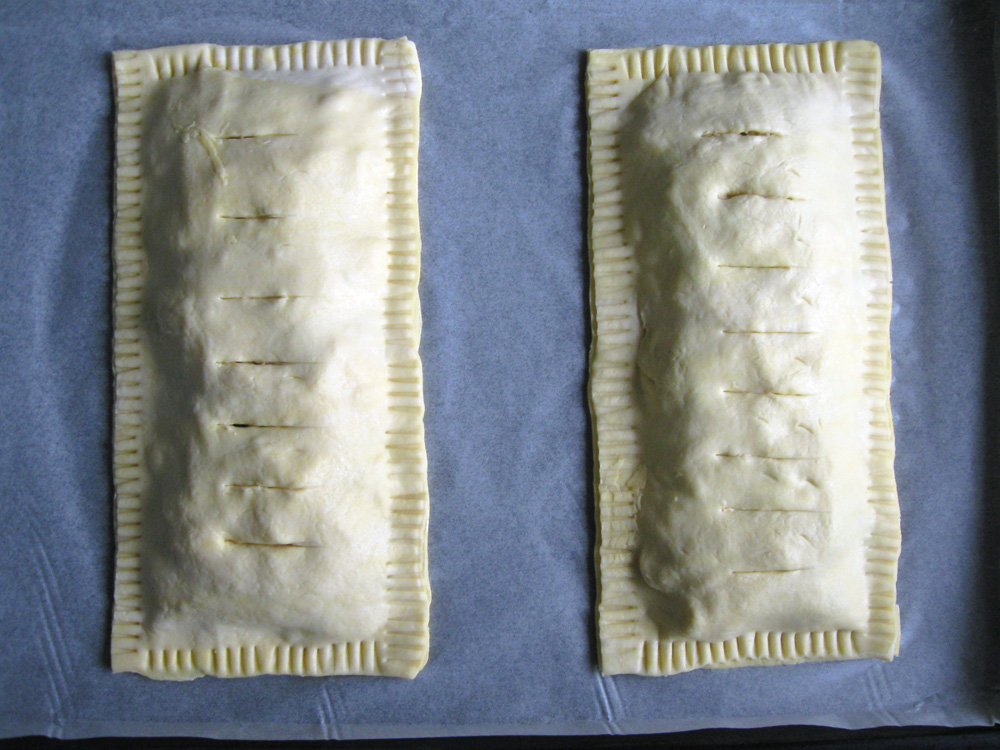 - Overlap the remaining sheets on top of the filling, press pastry sheets around edges using a fork. Make some cuts on the top sheet.
