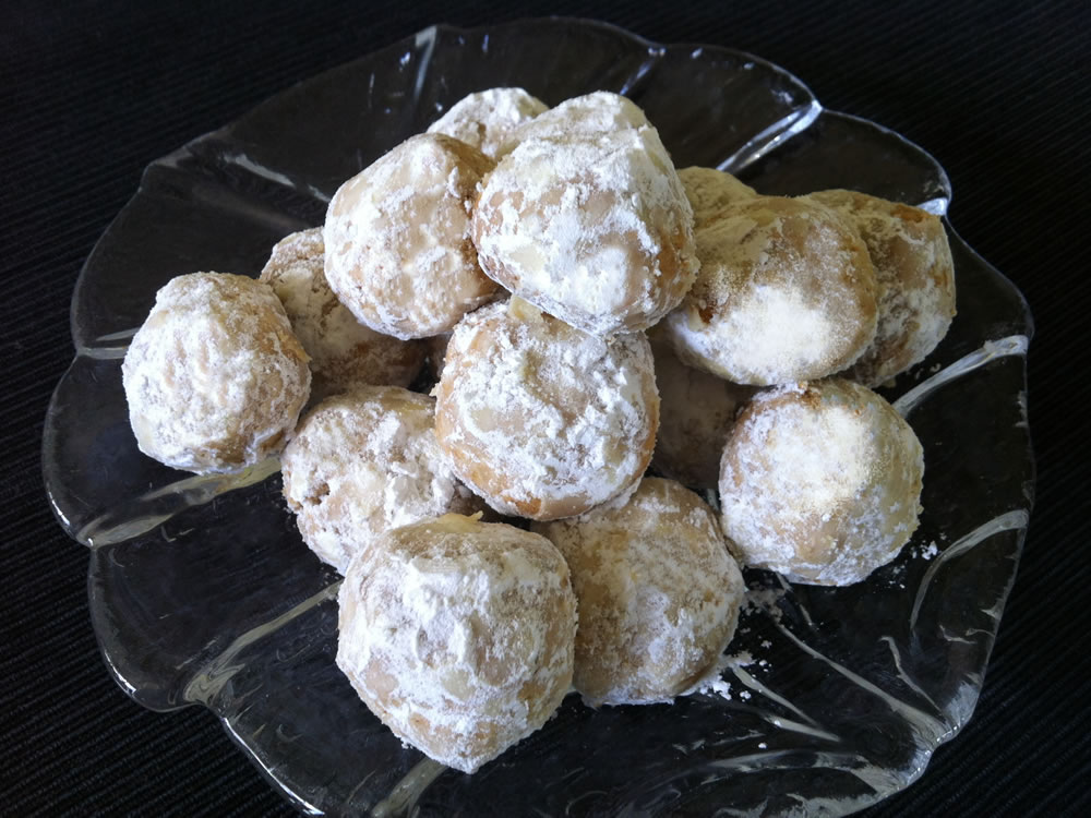 I wanted to make ‘Kinako Biscuits’ today but I didn’t have enough ‘Kinako’ which is the finely ground roasted Soybean. I used roasted Almonds instead. Using the food chopper, I ground the Almonds. I added some coarsely chopped Almonds as well. I rolled the baked biscuits in icing sugar to coat them. The result was …