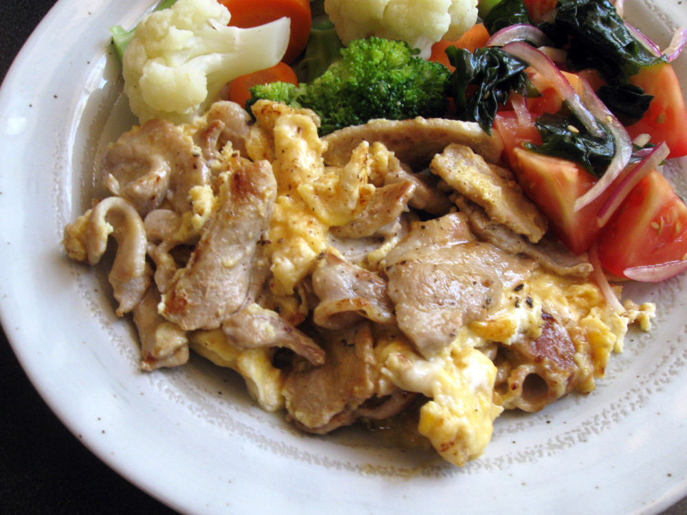 The other day, I cooked thinly sliced Pork Belly for dinner. I was tired and couldn’t think of any particular dishes, so I just stir-fried it and seasoned with Salt & Pepper. I was afraid the amount was not enough for us, then I added Eggs. I just poured whisked Eggs over the cooked Pork. …