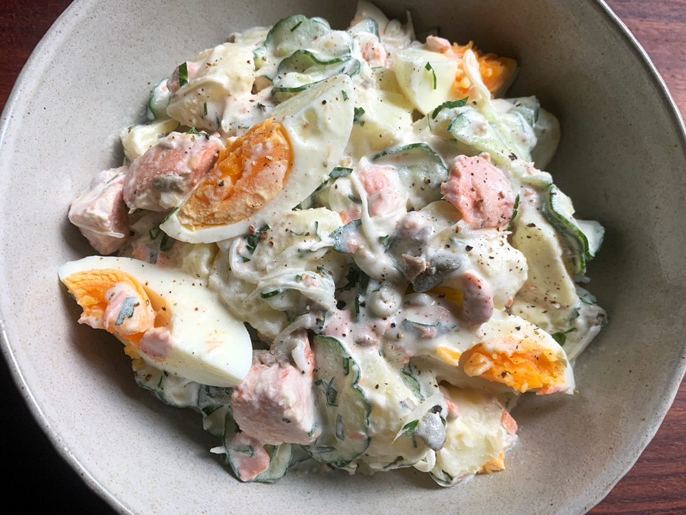 Japanese style Potato Salad contains thinly sliced Cucumber, that is slightly salted first. Water comes out from Cucumber, so you need to squeeze it to remove water before combining with other ingredients. Ham is a popular ingredient, but I used Canned Salmon today, and added Boiled Eggs. My ‘Water & Energy Saving Boiled Eggs’ is …