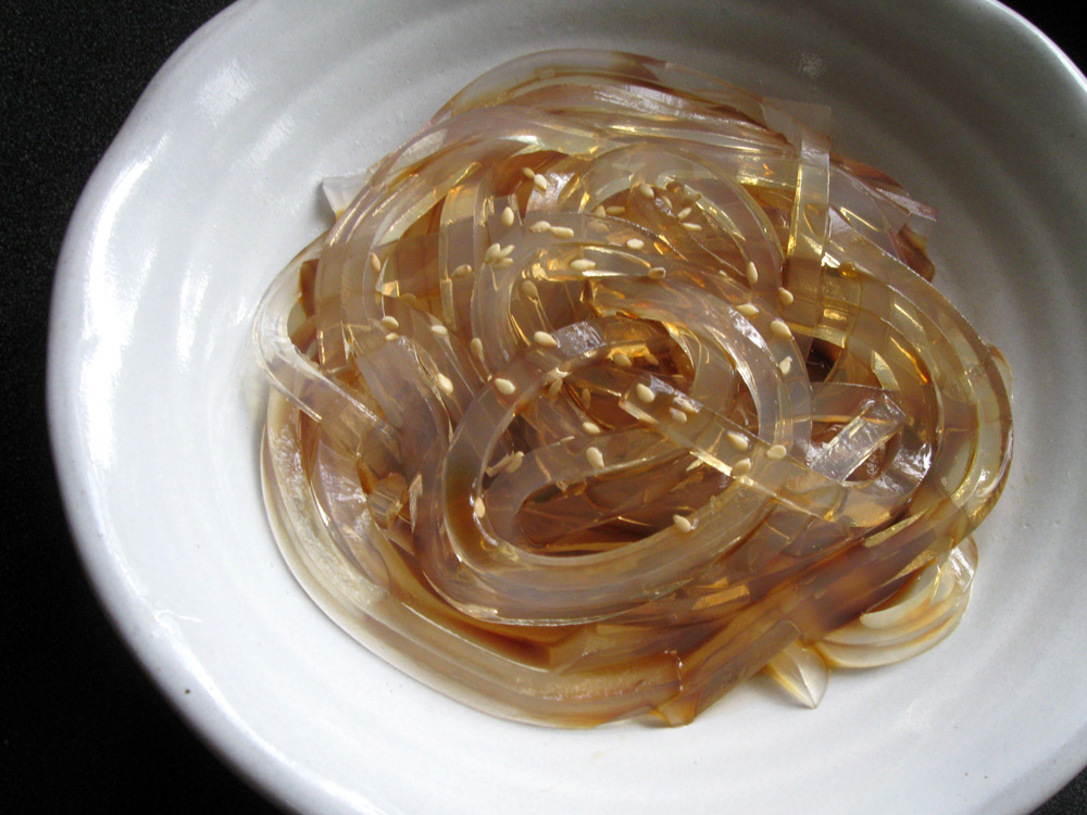 There is a food called ‘Tokoroten’ in Japan. It’s a firm jelly made from sea plants, very similar to Kanten that is a popular gelling agent. The Japanese have been eating ‘Tokoroten’ over a thousand years and it is still popular. Some people eat it as a sweet snack with Muscovado Syrup, but I like …