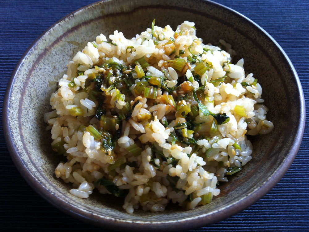 This is what my mother used to make with Daikon leaves. She used to pickle a large barrelful of Daikon to make ‘Takuan’. She didn’t waste the Daikon leaves. She pickled the leaves as well. She used just salt for leaves. The salty pickled Daikon leaves were still bitter & peppery. She often cut them …