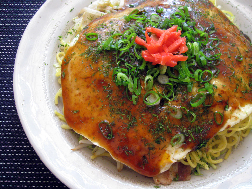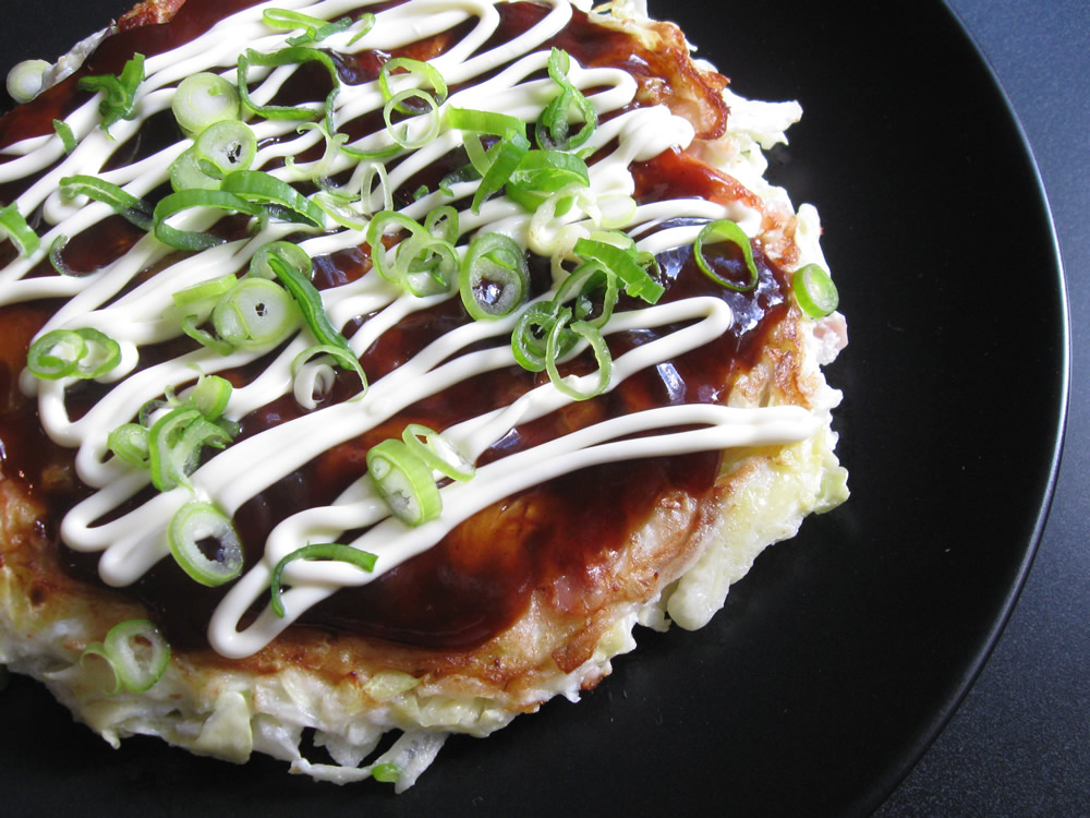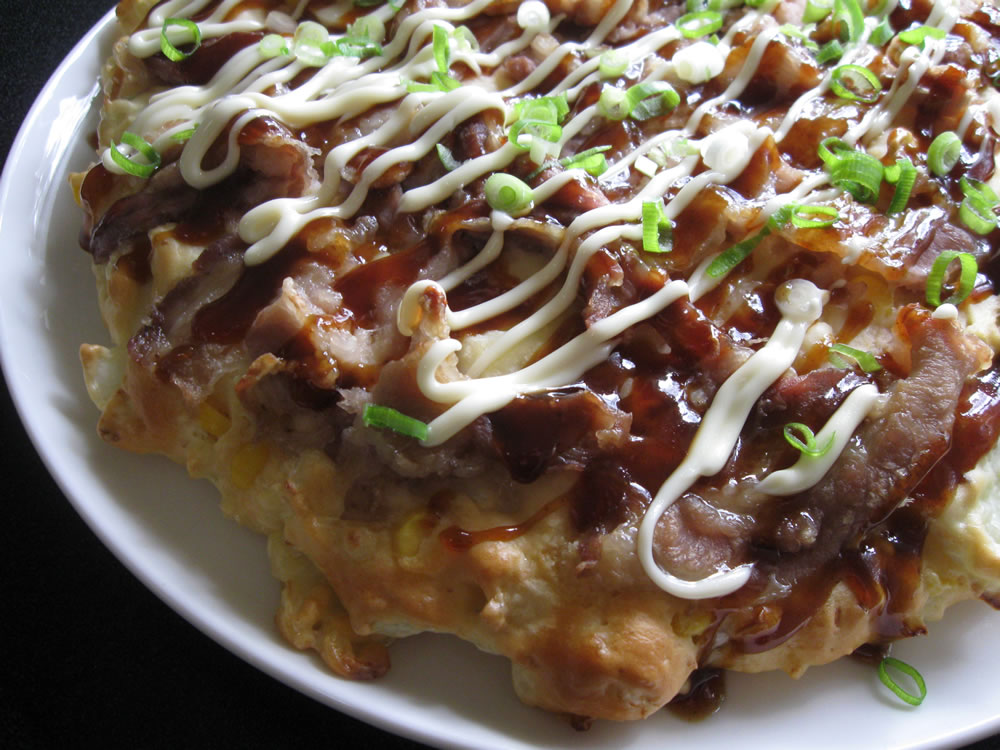 It takes time to cook ‘Okonomiyaki’, especially when you make many. When I cook it for whole family, I bake one large Okonomiyaki in the oven. Today’s Okonomiyaki is about 40 x 30cm. Such a jumbo Okonomiyaki can’t be flipped over, but I don’t need to to do so as I bake it in the …