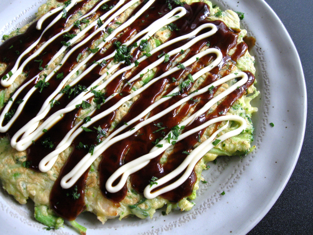 ‘Okonomiyaki’ is commonly made with Cabbage. I often make it with Kale. Broccoli version is also very yummy. Especially Broccoli stems are perfect for this ‘Okonomiyaki’. When Broccoli are in season and they are tasty and cheap, why don’t you try it? I like Prawns for Broccoli version, but you can use Squid, Pork, Ham, …