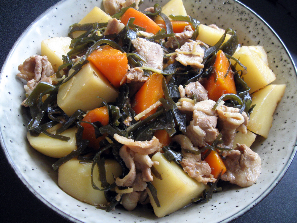 ‘Nikujaga’ is the dish of ‘Niku’ (Meat) and ‘Jaga’ (Potato) cooked in sweet soy sauce flavoured broth. It is one of the most popular Japanese home-cooked dishes. Today I added Kombu (Kelp) to it. I think Pork is most suitable, but Chicken OR Beef can be used. You have never seen a dish like this …