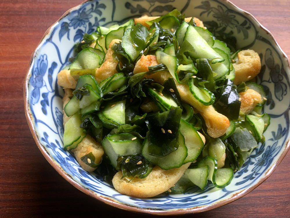 ‘Wakame & Cucumber Salad’ is one of the most popular Japanese salads called ‘Ae-mono’. Any cooked seafood such as Prawns, Squid and Scallops, OR Chikuwa (Tubular Fishcake) can be a great addition to it. My mother often adds ‘Shirasuboshi’ (しらす干し), dried whitebait. Today I added ‘Abura-age’ (Thin Fried Tofu) for a vegan version. These ‘Abura-age’ …