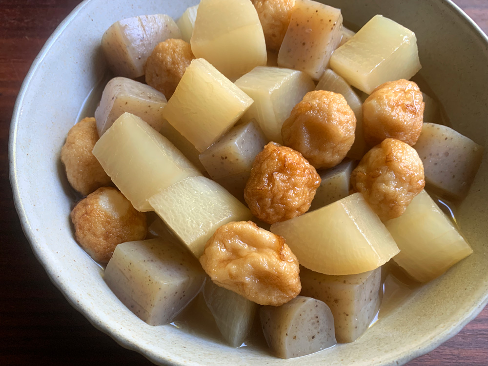 This is my easy version of ‘Oden’, a popular Japanese one-pot dish. My favourite ingredients in ‘Oden’ are Daikon, Konnyaku (Konjac) and Fish Balls. So, I just cook those three ingredients for this easy version. I recommend to cook this dish ahead of dinner time, and reheat before serving. Daikon and Konnyaku would taste much …