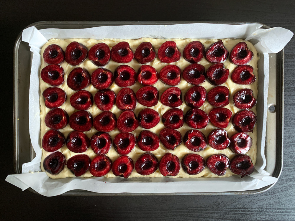 This cake can be made with any fruit. Plums, Nectarines, Peaches and Apricots are nice. Today I used Dark Cherries, and they were very sweet. The cake was tasty, but I wished if the Cherries were sour. If you have sour Cherries, they would be perfect.