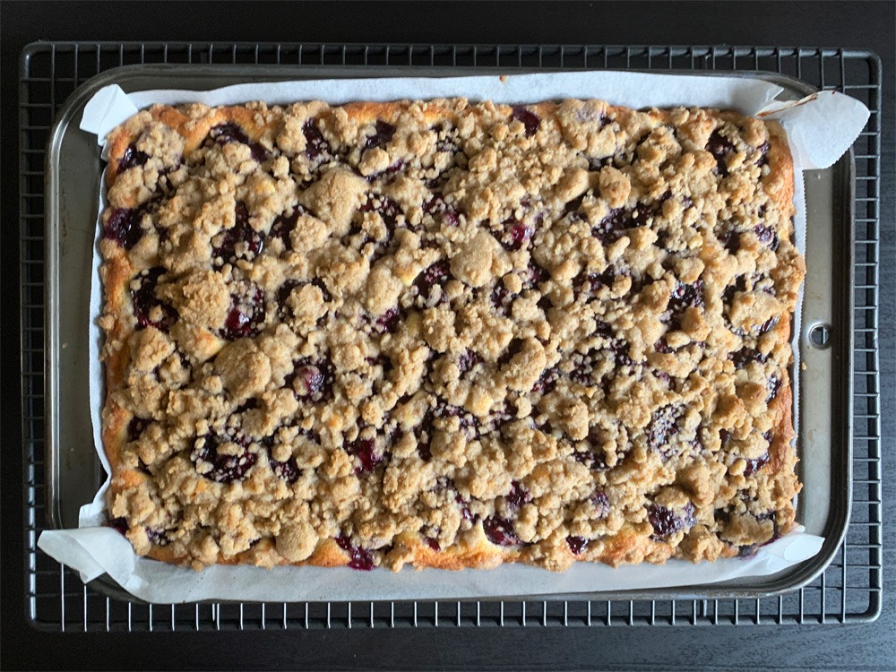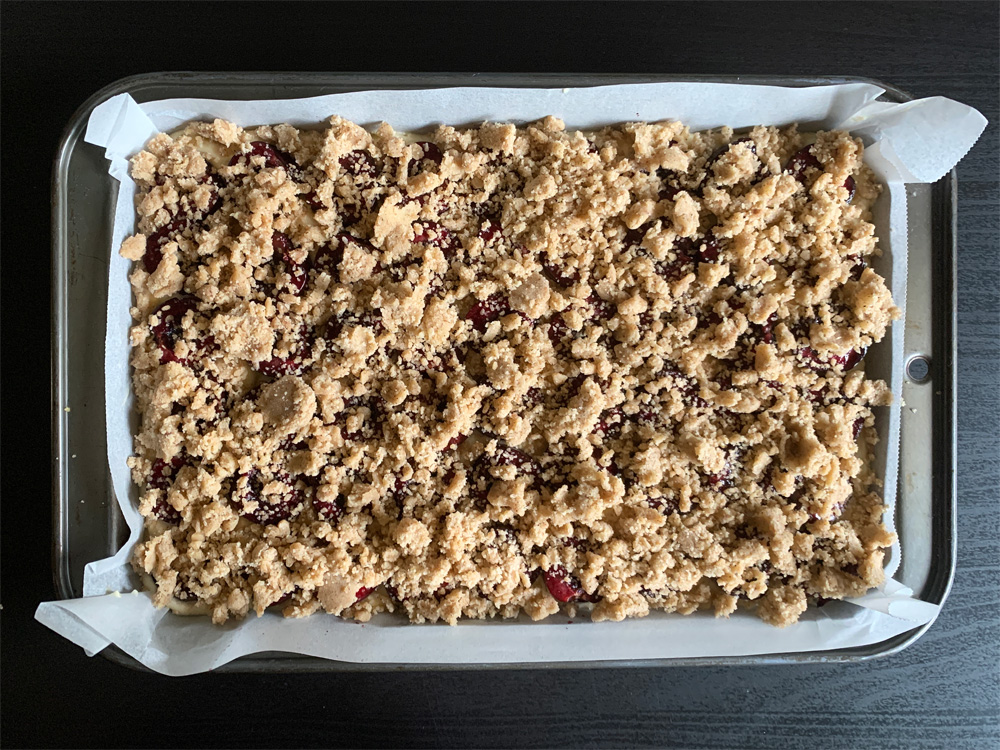 - Arrange Cherries over the mixture with cut side facing up, then scatter the Cinnamon Crumble evenly.