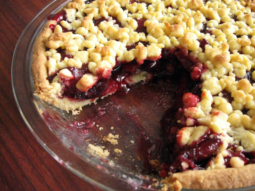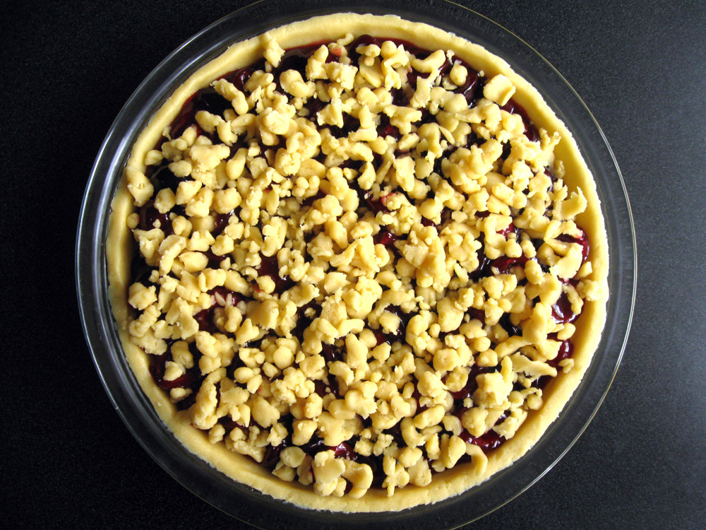 - Spread the Cherry Filling over the Pastry in the pie dish, cover with the crumbled saved Pastry.