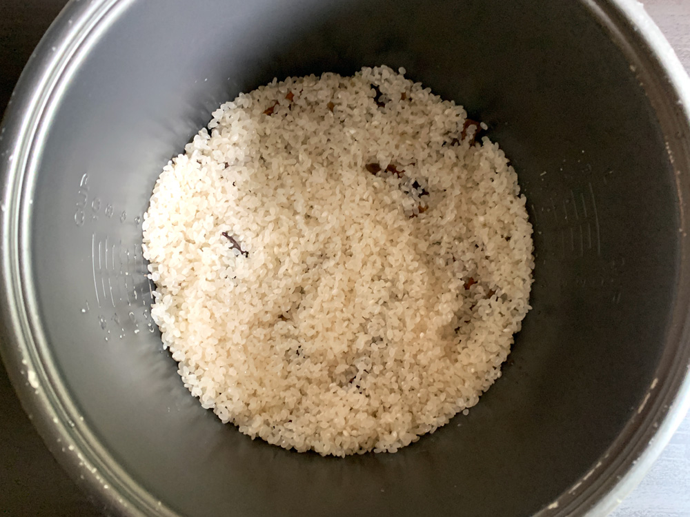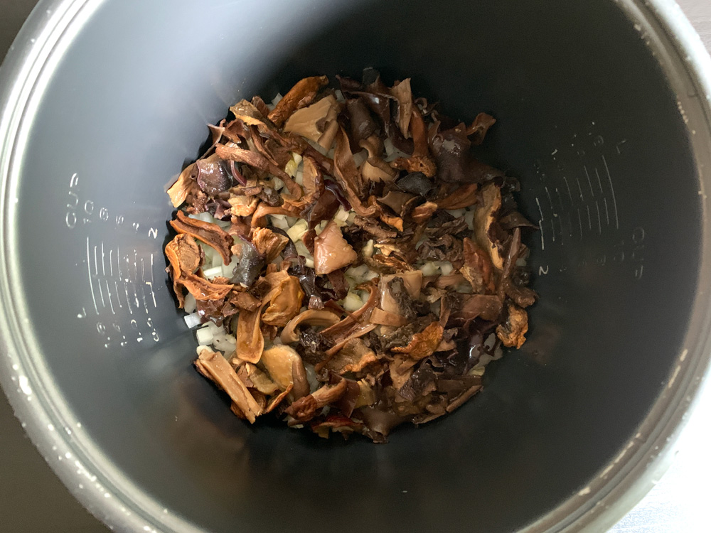- Place Onion, Garlic and softened Mushrooms in the rice cooker’s inner pot. Drizzle with Olive Oil.