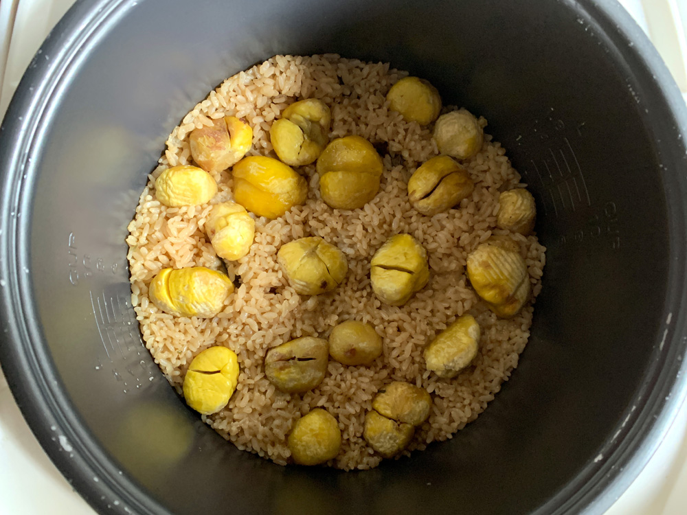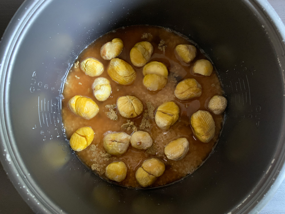 - Add the saved 450ml Water that is used to soak Dried Mushrooms and Stock Cube, sprinkle Salt, but DO NOT stir. Scatter Chestnuts on top. Press Cook/Start button.
