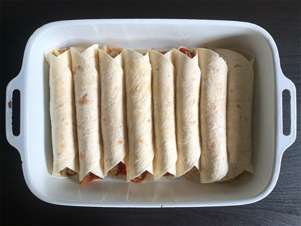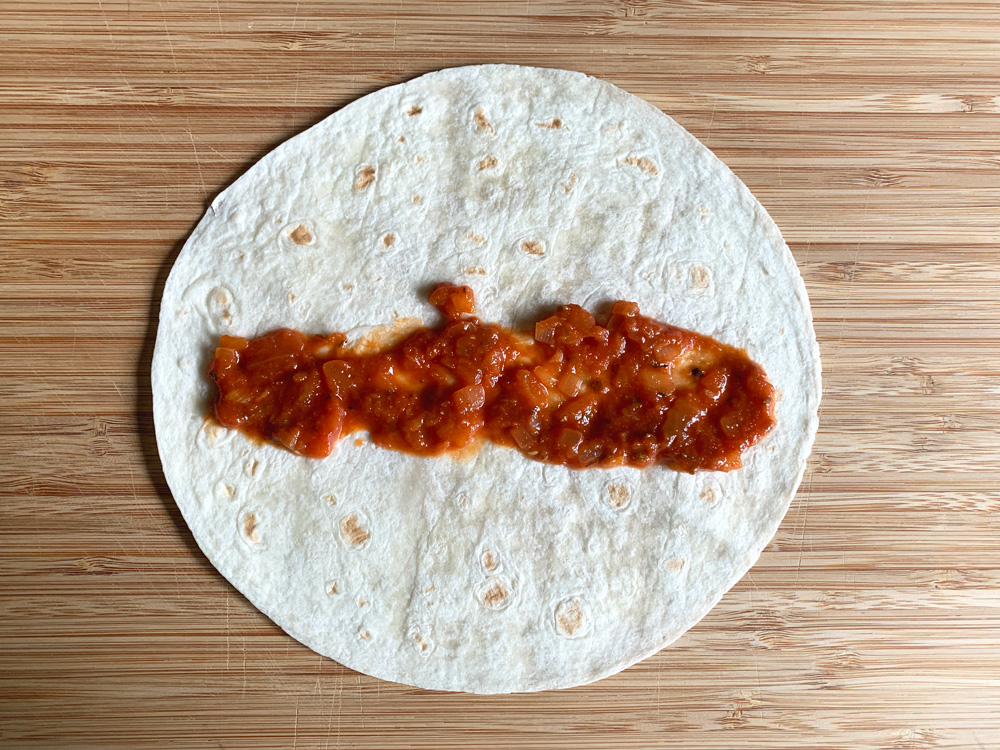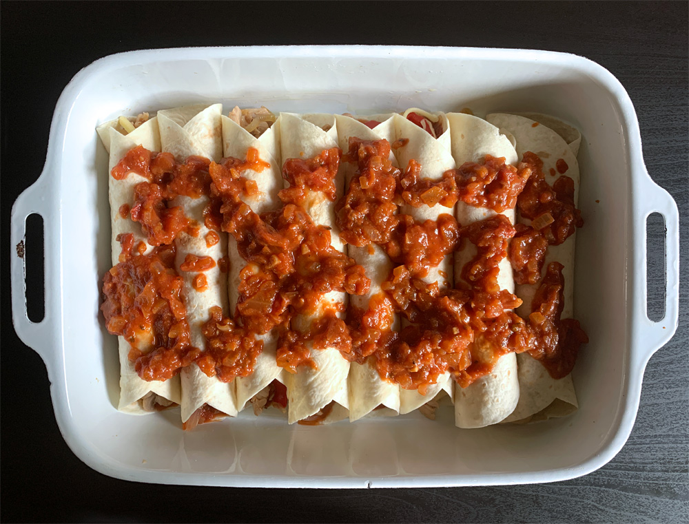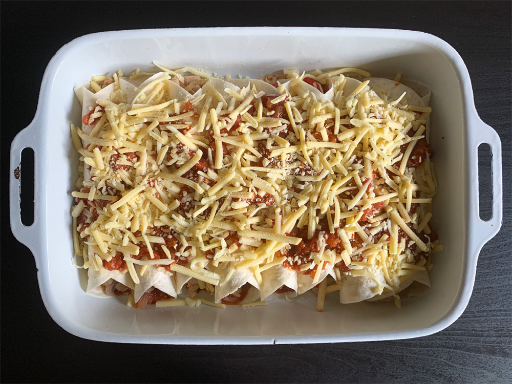 - Place a Tortilla on a flat surface, spread 1 tablespoon of Enchilada Sauce, place 1 portion of Chicken mixture, and add some Cheese.