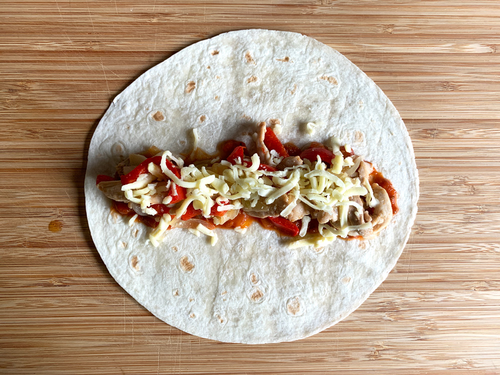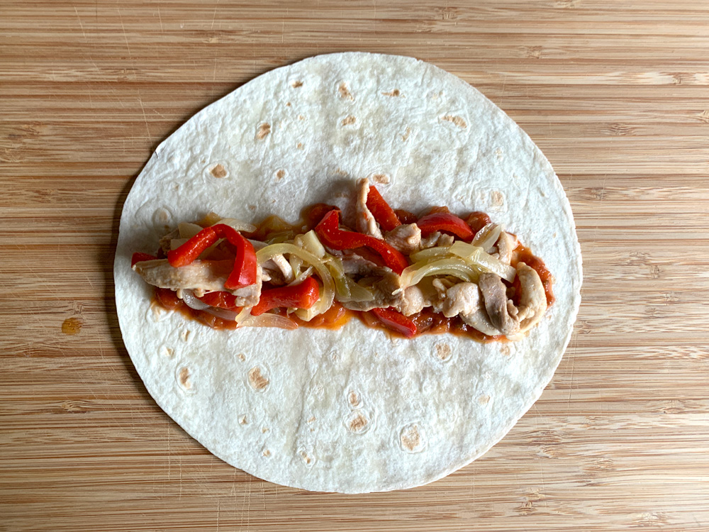 - Cut Chicken Fillets, Onion and Capsicum into thin strips OR bite-size pieces. Heat Oil in a frying pan over medium high heat, cook Chicken, Onion and Capsicum, and season with Salt & Pepper. Divide into 8 portions.