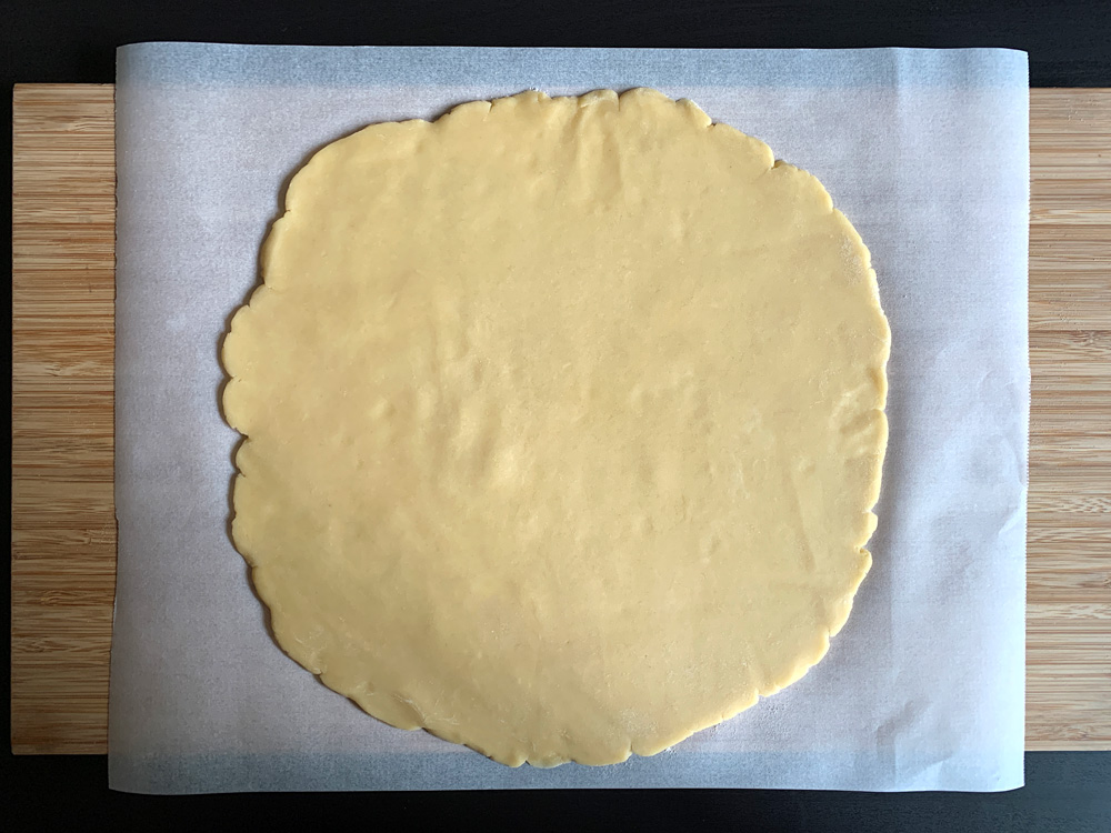 - Knead the dough gently on a lightly floured surface and shape into a disc. If it is too soft to work with, leave it in the fridge until firm.