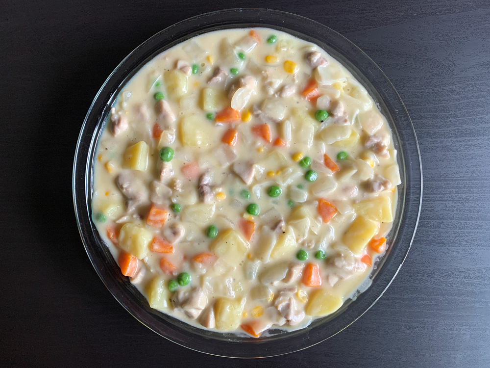 - Heat Oil in a large frying pan OR pot, cook Chicken and all Vegetables, except for Peas and Corn, until cooked. Vegetables don’t need to be absolutely soft.