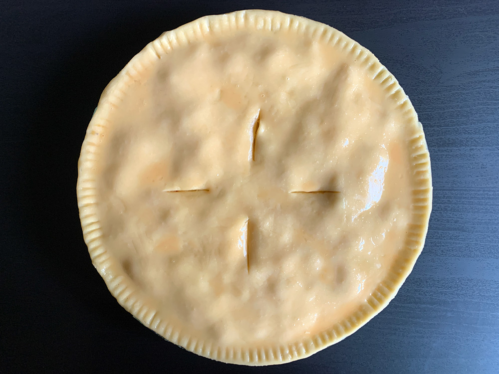 - Roll the Shortcrust Pastry to the size larger than the pie dish, cover the Chicken mixture, and trim off the pastry. You may wish to make a pattern on the edges. Make some cuts in the pastry and brush with the saved Egg.